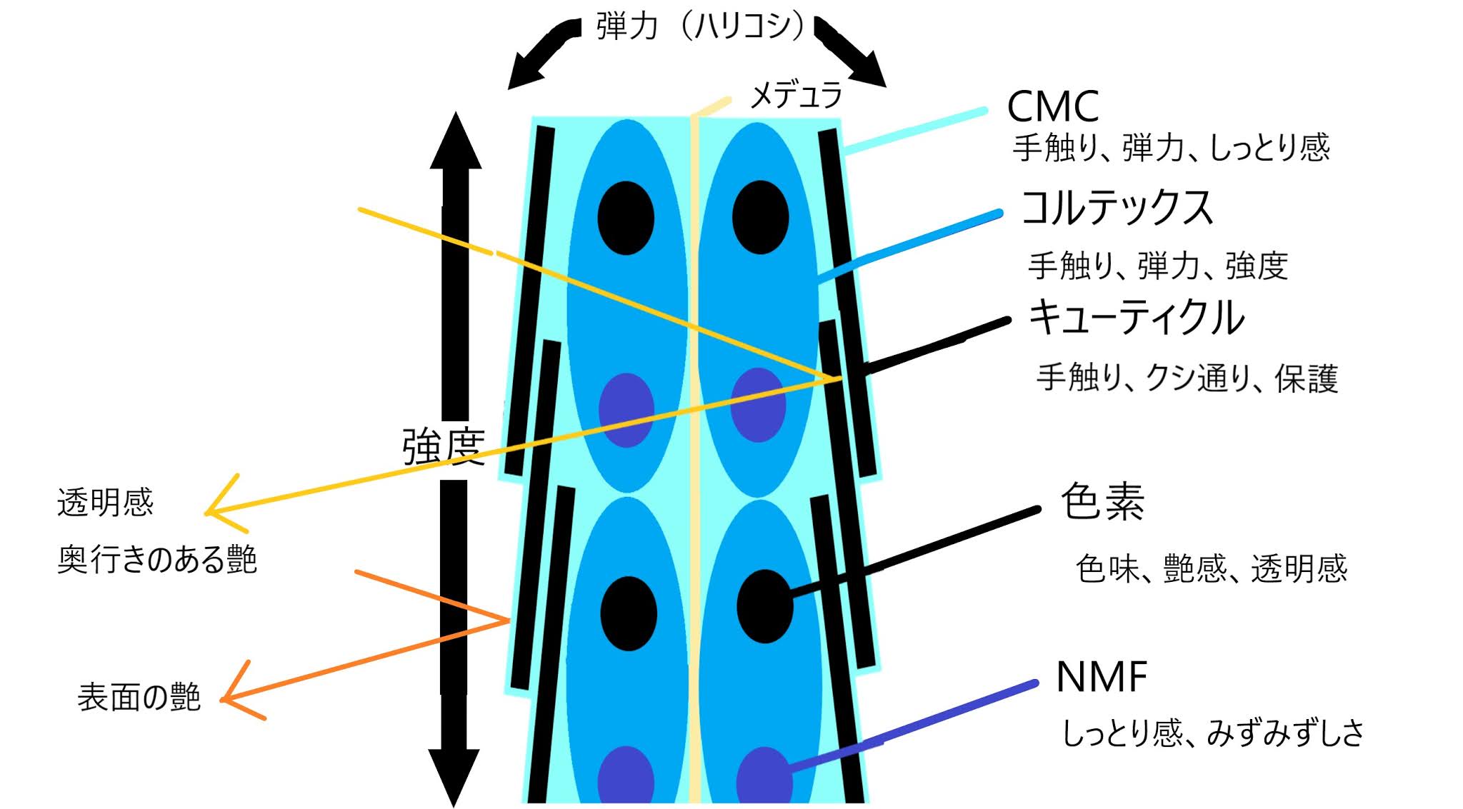 毛髪の形を作る「骨格(ケラチンタンパク)」や硬さ、柔らかさなどハリコシを決める「骨格の繋ぎ目(各種結合)」と、水分を保持したり骨格を保護する「脂質(CMC,間充物質)」や「保湿成分(NMF)」、それらに保持される「結合水」、色を決める「色素」などが複雑に存在します。